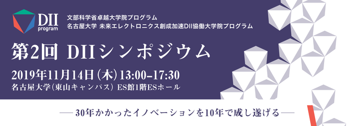 2019年09月20日(金) イベント 第2回 DIIシンポジウムを開催します 2019年11月14日に名古屋大学にて、未来エレクトロニクス創成加速DII協働大学院プログラムの第2回シンポジウムを開催いたします。 詳細はこちらをご覧ください